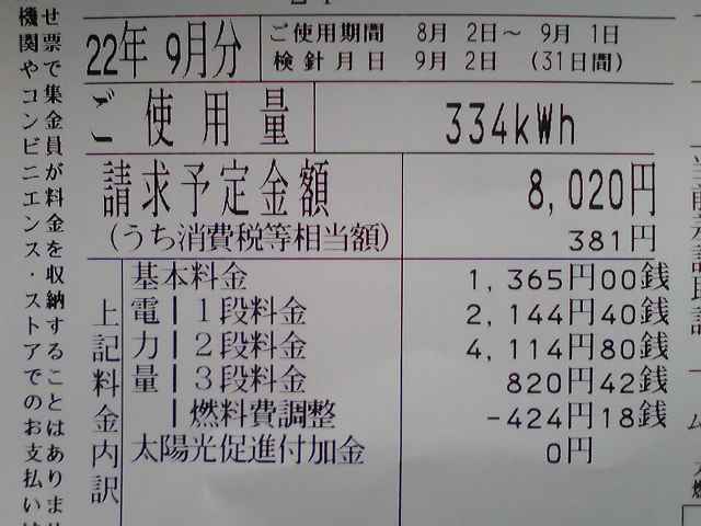 2010年8月2日~9月1日の使用電気料は334kWh、請求予定金額が税込8,020円!